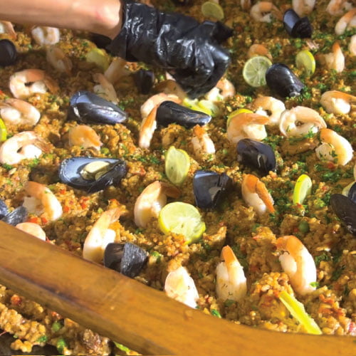 Immerse yourself in the culinary spectacle as skilled chefs prepare authentic paella right before your eyes. Prepare to be captivated by the sights, sounds, and flavors of this beloved Spanish rice dish as it comes to live right in front of your eyes. At the heart of the station is a large, shallow pan called a "paellera." The chefs set up a live cooking station with an open flame, creating an enticing visual display ensures the even cooking and caramelization of the ingredients, imparting a distinct flavor to the paella.