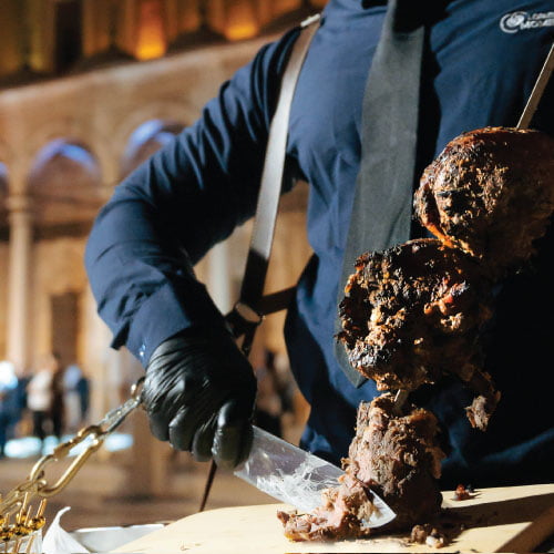 A culinary journey that celebrates the rich tradition of Brazilian barbecue and the art of communal feasting. Treat guests to the tantalizing aroma of sizzling meats and the lively atmosphere of celebration. The rodizio-style service features a parade of expertly prepared meats carved to your guests by skilled "espeto corrido" passadores (meat servers). Our Rodizio experience is an all-time favorite and recommended for all event types. The menu typically features Sirloin, Ribeye, Filet Mignon, Oriental Sausage, and Sheesh Tawook with four mouth-watering dipping sauces that perfectly pair with the prime meat selection.