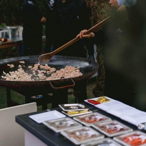 The chefs set up a live cooking station with an open flame, creating an enticing visual display ensures the even cooking and caramelization of the ingredients, imparting a distinct flavor to the paella.